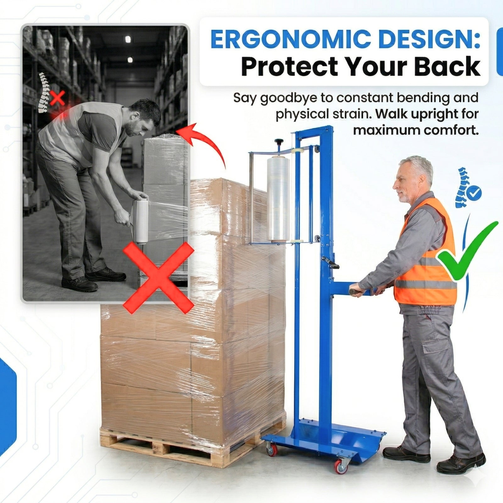 【Ergonomic Design & Back Saving】 Say goodbye to back strain and dizziness from traditional bending and circling. This mobile pallet wrapper allows you to stand upright while wrapping pallets, significantly reducing physical fatigue and improving workplace safety.