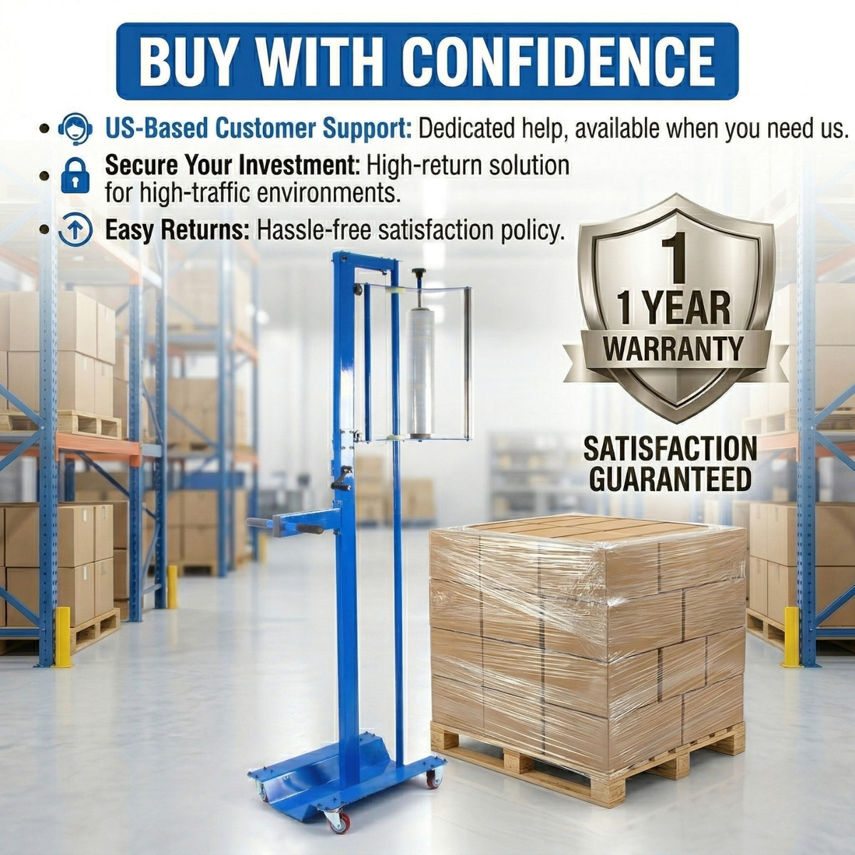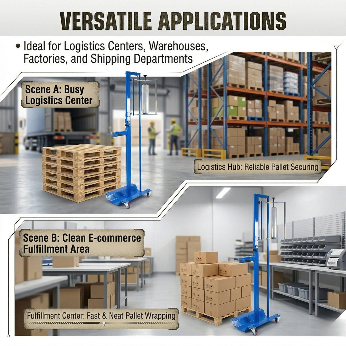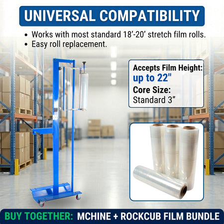 【Universal Compatibility】 Designed to work with most standard 12-20 inch stretch film rolls. Ideal for busy warehouses, logistics centers, and shipping departments looking to increase packaging efficiency without the cost of a fully automatic turntable machine.